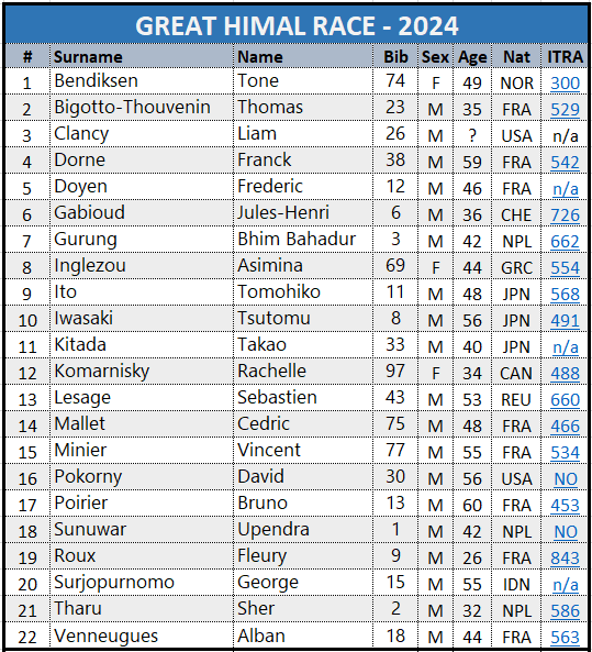 Εξαίρεση αποτελεί φυσικά ο Bruno Poirier, διευθυντής του αγώνα που όμως θα αγωνιστεί και ο ίδιος, όπως συνηθίζει εξάλλου! Ο Bruno έχει ένα αρκετά πλούσιο βιογραφικό στο σχετικά μακρινό παρελθόν, με πολύ καλό επίπεδο και επιδόσεις, ειδικά στο UTMB, από το οποίο δεν έχει απουσιάσει ποτέ από καταβολής του! Συνεχής και η παρουσία του στους αγώνες που ο ίδιος διοργανώνει στο Νεπάλ από τις αρχές του 2000 (Annapurna Mandala, Himal Race κλπ). Αγωνίστηκε και το 2017 στο παρθενικό GHR.
