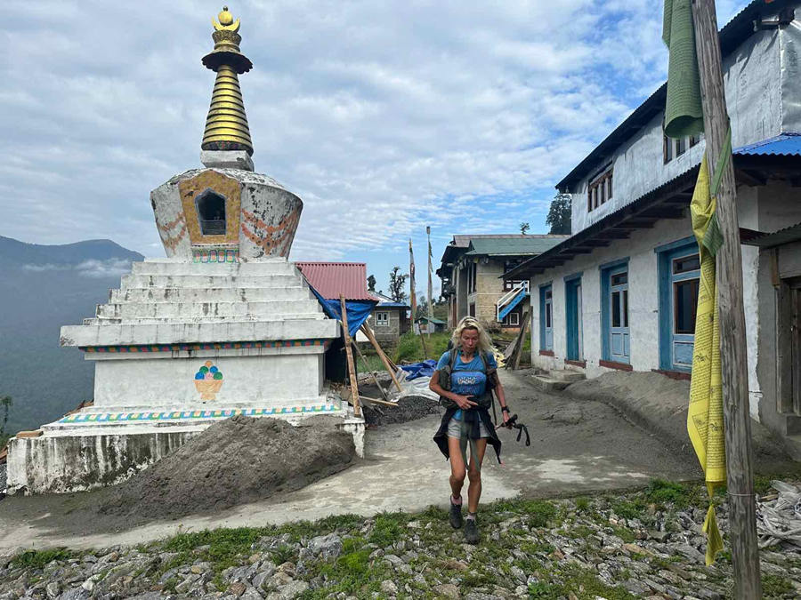 Τυπικό μονοπάτι στους λόφους, με ένα τσόρτεν ή στούπα (chorten / stupa) ψηλά, πάνω στο διάσελο. Τα τσόρτεν-στούπα είναι κατασκευές πίστης του βουδιστικού δόγματος, υποδηλώνουν την παρουσία του Βούδα και βρίσκονται πάντα κατά μήκος των μονοπατιών, προσφέροντας ευλογία στους πιστούς